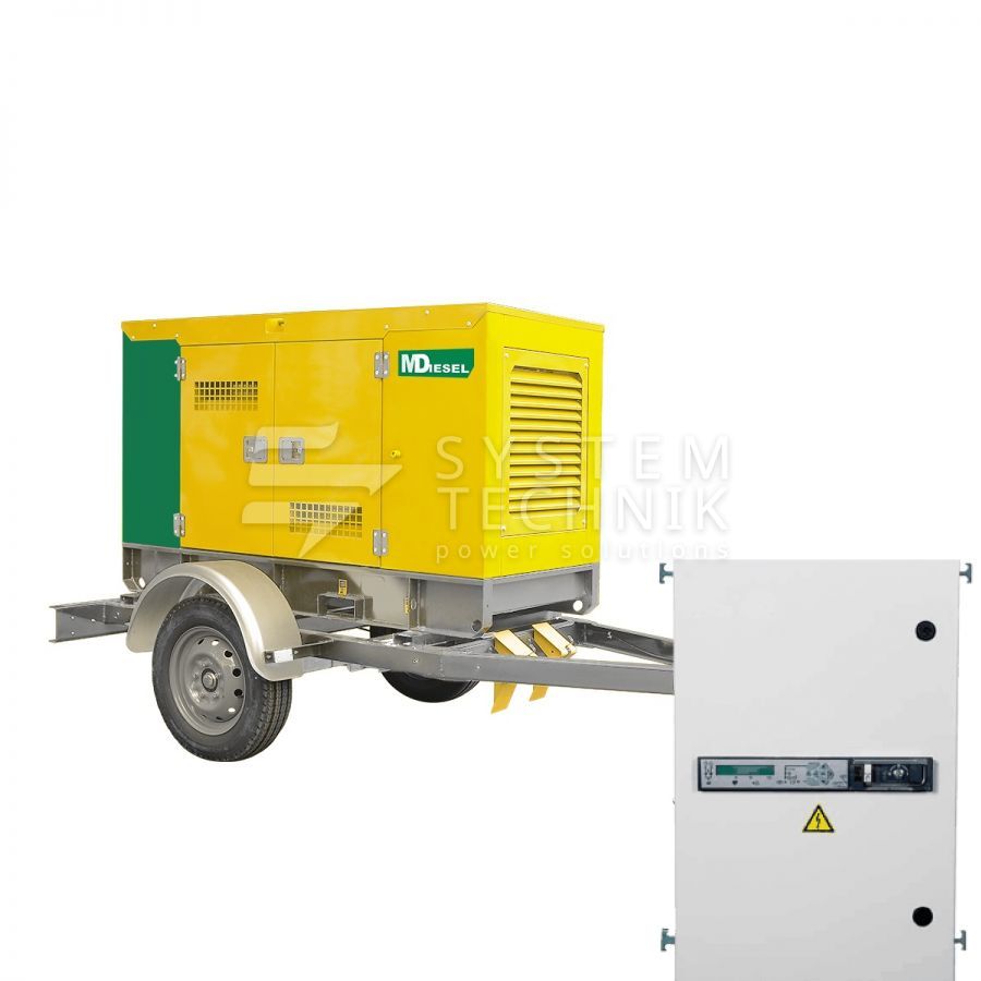 - MitsuDiesel МД ЭД-30-Т400-2РКМ29 в шумозащитном кожухе на шасси с АВР на прицепе
