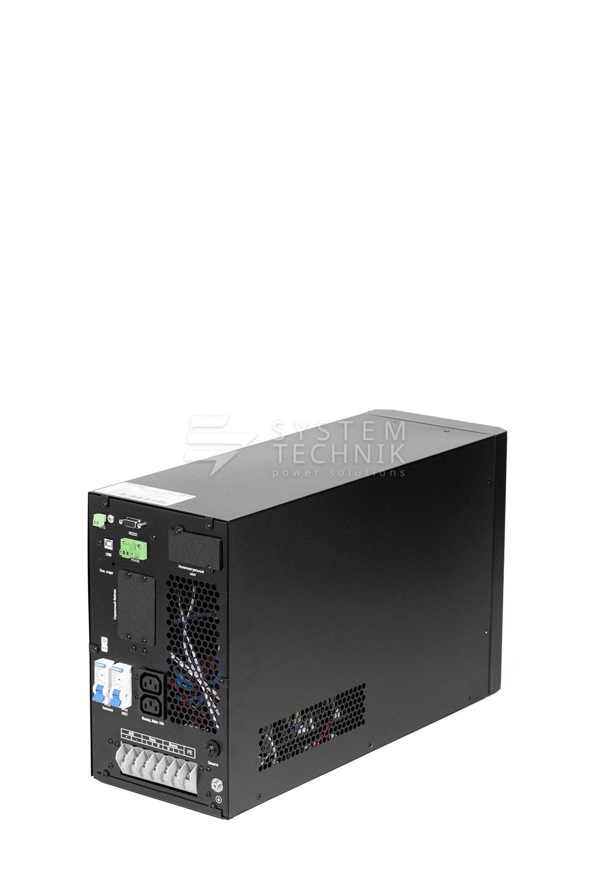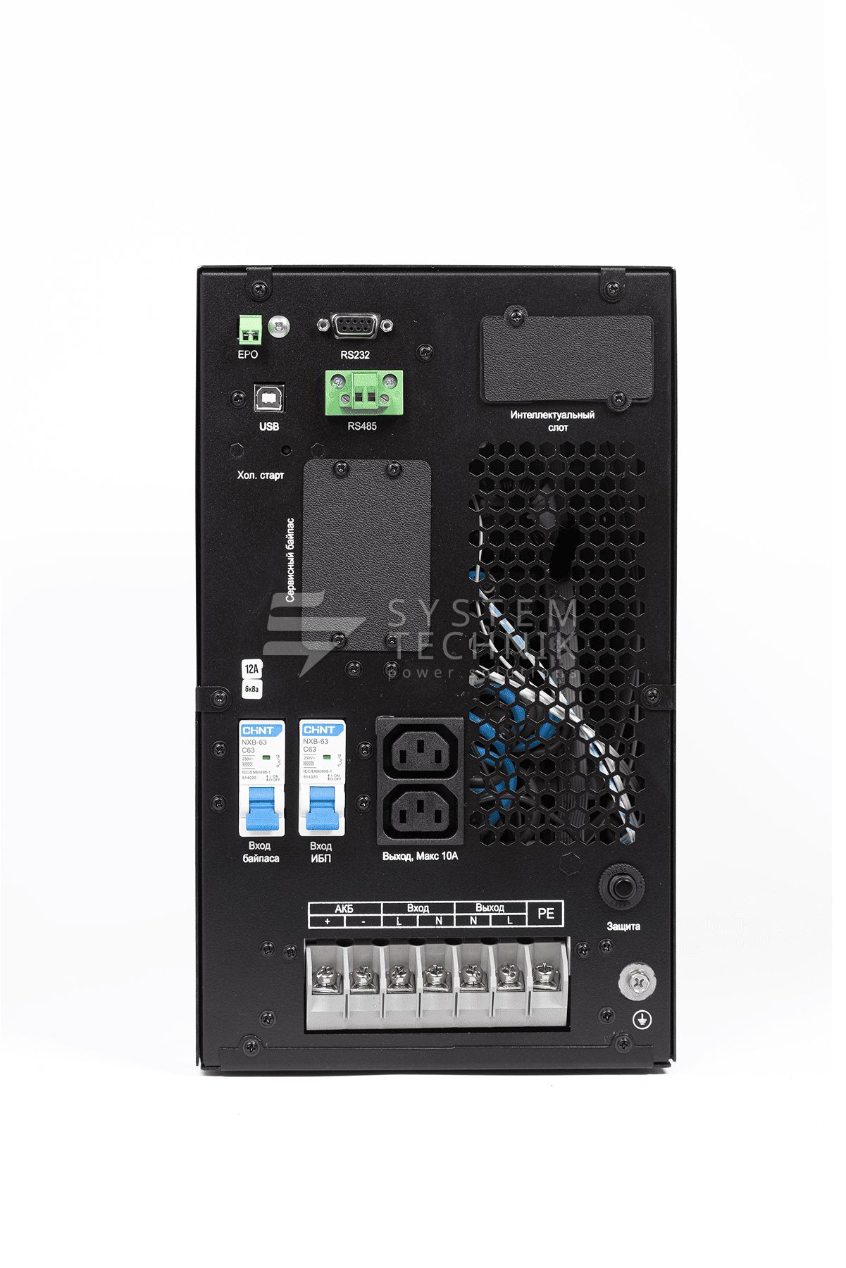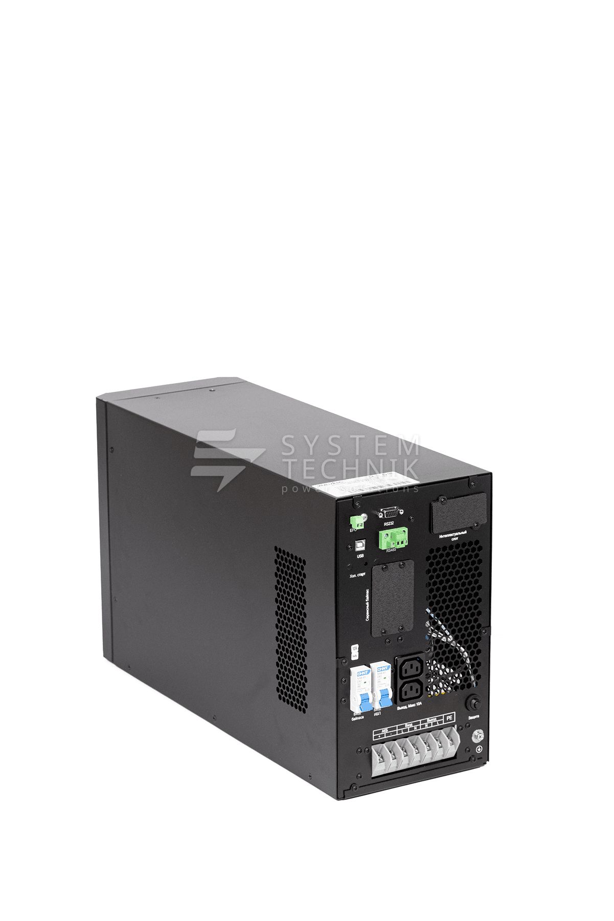 | Тип выходных разъемов питания | USB, RS232, EPO, RS485 (опционально) Смарт-слот (для опциональной установки SNMP/Сухих контактов), карта параллельной работы (опционально) |